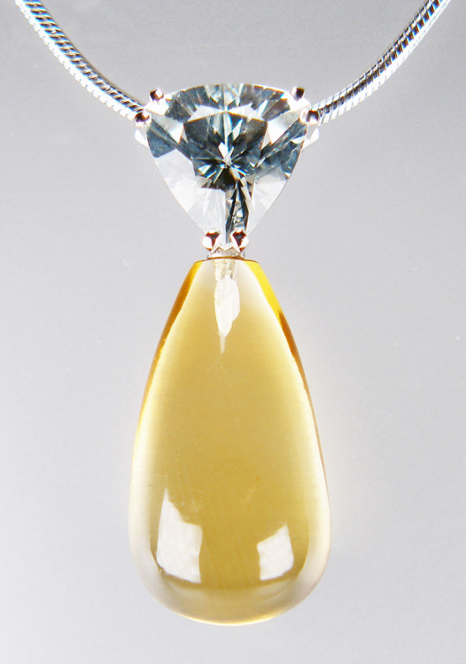 10/18mm polished drop shaped citrine suspended from a 1.40ct trillion cut goshenite (colourless beryl), on an 18” snake chain, all in 9ct white gold. The pendant is 27mm long. This pendant and chain is included in our 20th anniversary 50% sale and now costs £295.
