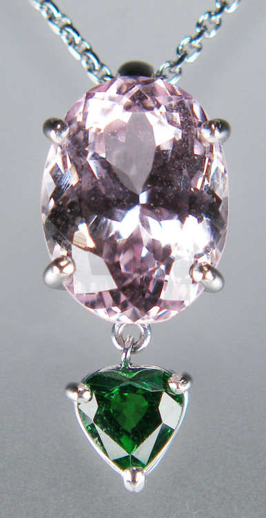 5.95ct oval kunzite with 0.85ct heart cut tsavorite garnet, both gems claw set in 18ct white gold pendant with chain running behind. Price includes chain. Pendant is 23mm long