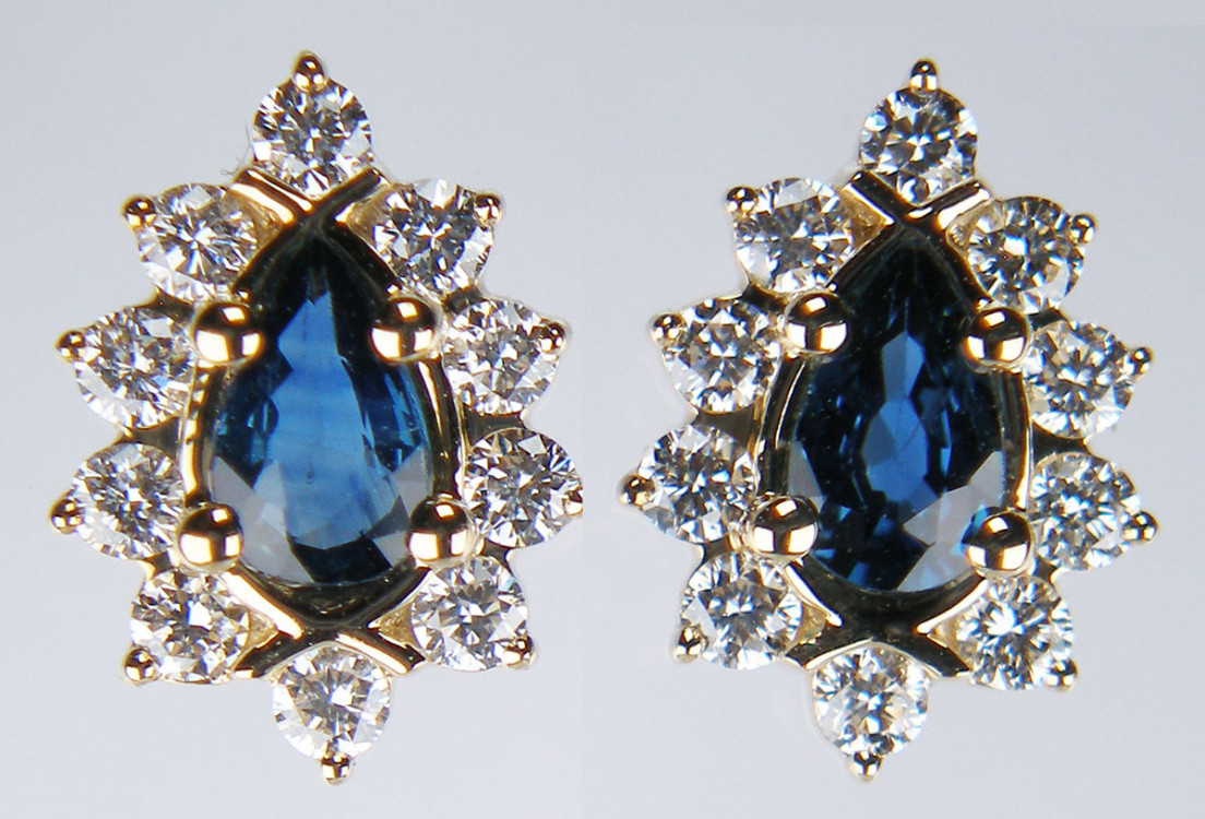 Pear shaped dark sapphire & diamond earstuds in 9ct yellow gold // £ 840