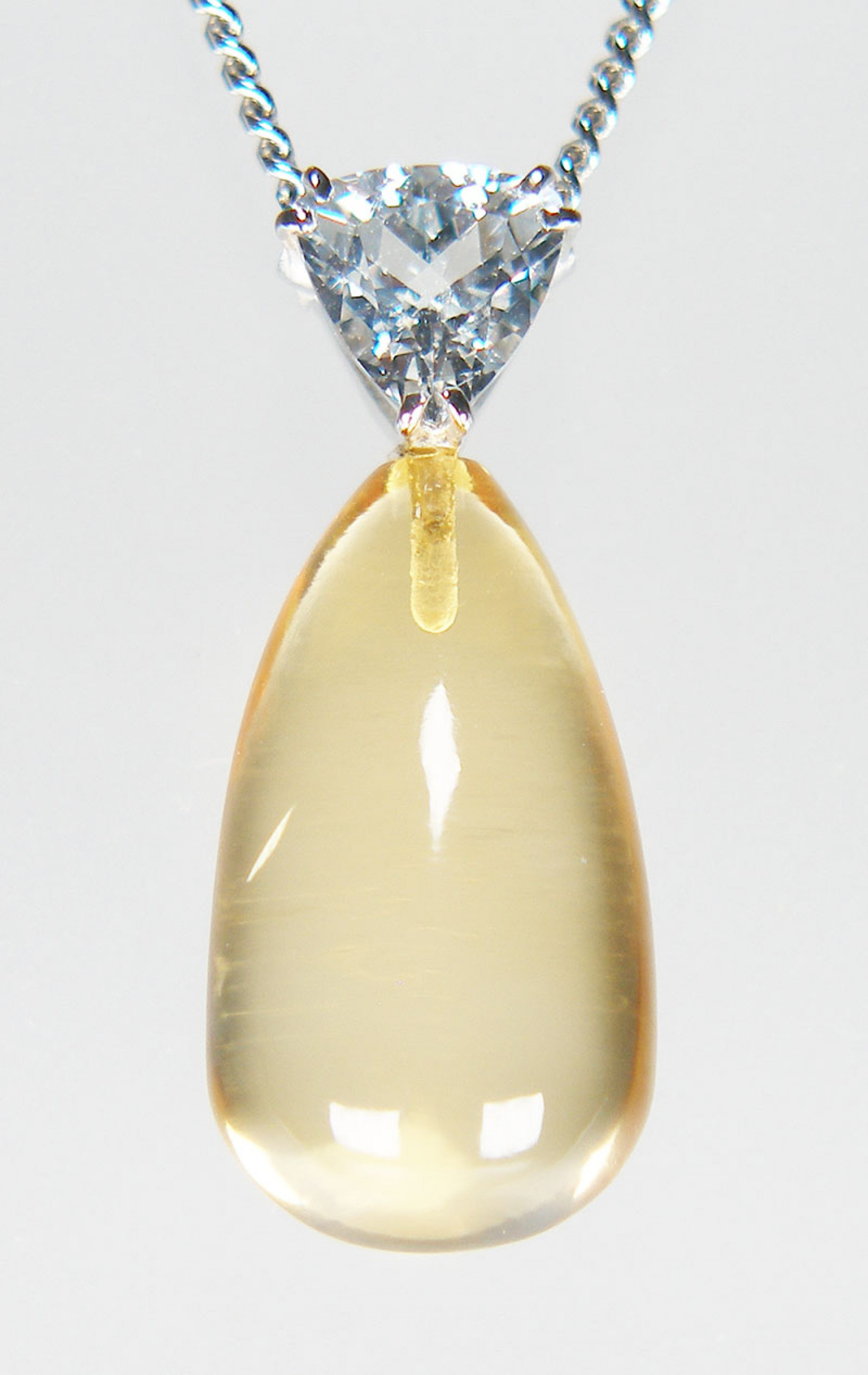 10x18mm polished drop shaped citrine suspended from a 0.70ct trillion cut goshenite (colourless beryl), on an 20” curb link chain, all in 9ct white gold. The pendant is 27mm long. This pendant and chain is included in our 20th anniversary 50% sale and now costs £295.