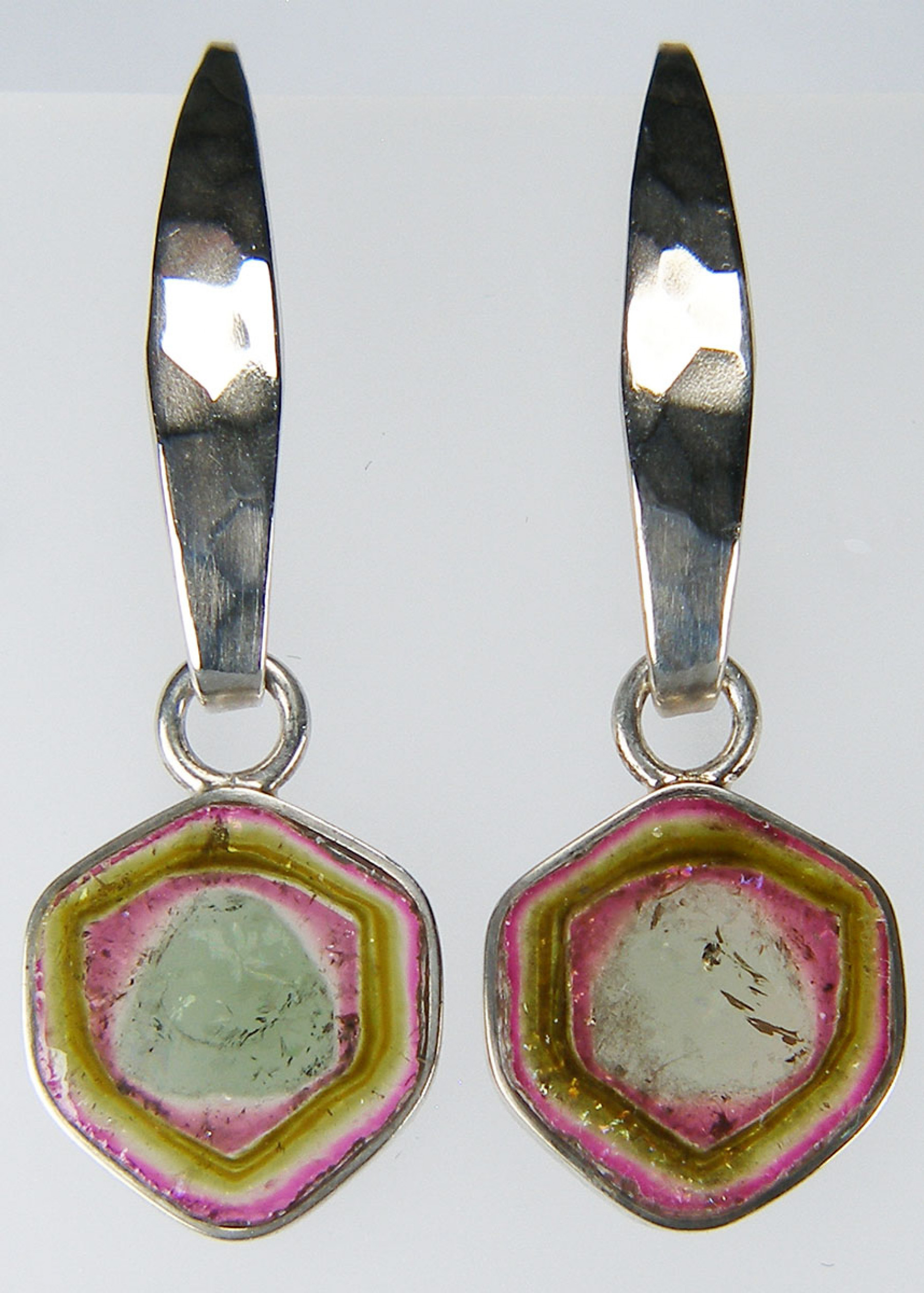 Watermelon tourmaline slices, spectacle set in silver and suspended from beaten silver earhooks. Earrings are 40mm long. These earrings are included in our 20 year anniversary sale and are now £97.50