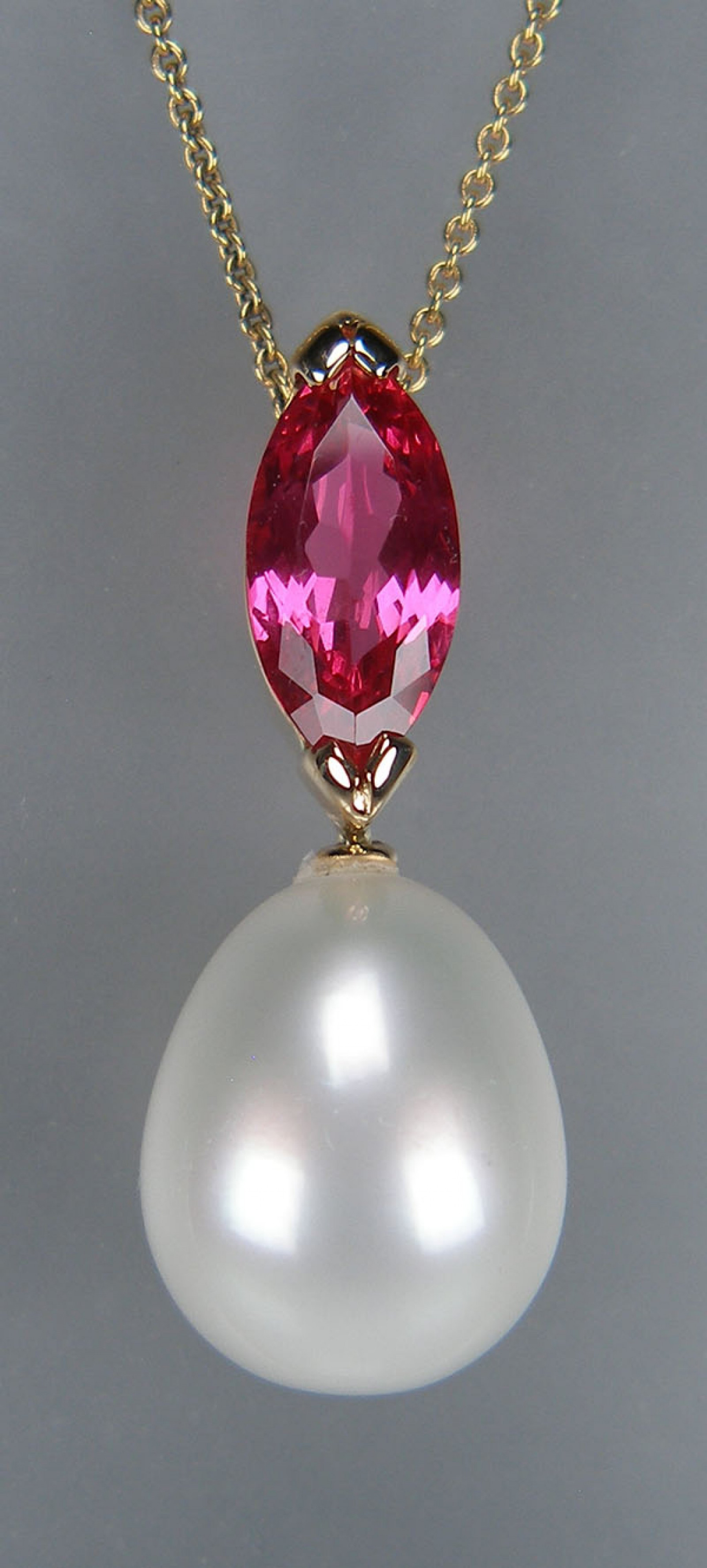 2.17ct marquise cut natural pink spinel from Mahenge, Tanzania of exceptional clarity & brilliance set above an Australian South Sea cultured pearl drop measuring 12.5x15.1mm with excellent lustre. The pearl is supplied by Pearls of Australia of Cygnet Bay and is accompanied by a certificate of authenticity. The pendant is made in 18ct yellow gold and suspended from a 20” adjustable trace link chain in 18ct yellow gold.