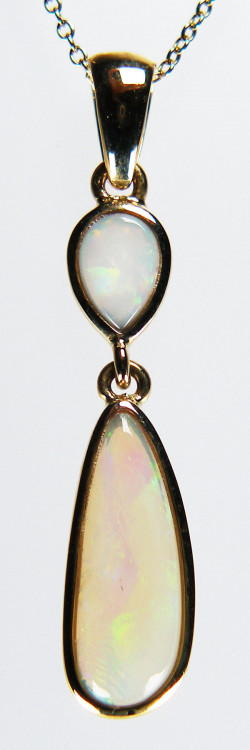 Delicate elogated and pear shaped white opal cabochons rubover set in 9ct yellow gold pendant. The pendant is 23mm long. The chain is avaailable for separate purchase.