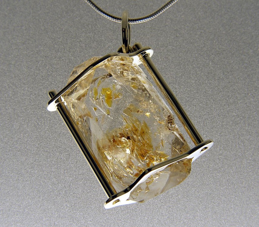 Beautiful custom cut trilion prasiolite cut by Ivan Williamson of Hascosay Gems, set as a pendant in customer’s own 18ct rose gold
