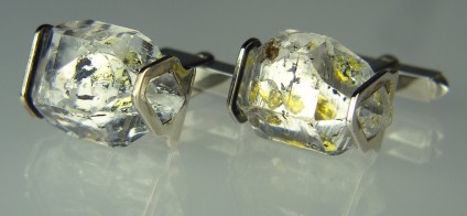 Cufflinks in 9ct yellow gold, larger crystals. Rare oil included quartz crystals from Balochistan are set in individually handmade gold mounts. The crystals are approximately 2-3cm in all dimensions and contain golden droplets of light oil, along with darker bitumen and an aqueous solution. The inclusions fluoresce a strong bluish green under UV light. Each pair of cufflinks comes with a UV pen torch and an explanation of the crystal. These crystals are extremely rare and it is difficult to find such perfect examples as sold by Just Gems. The setting is precisely made to fit each unique crystal and has to be created without the application of heat, which could cause the crystal to fracture. Each piece is handmade in Scotland and hallmarked in Edinburgh. Pendants and earrings also available. A selection of crystals are available for bespoke designs.