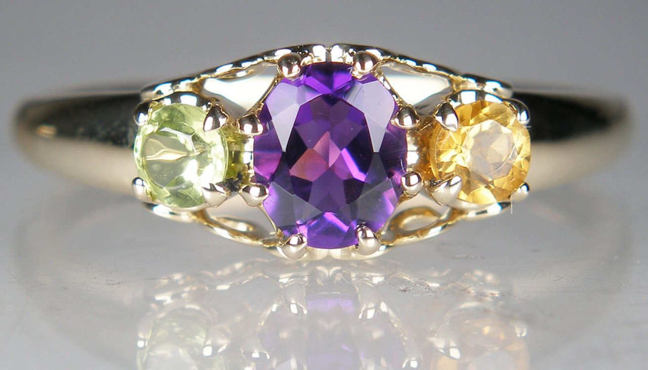 Vintage style ring set with oval amethyst, round citrine and peridot all mounted in 9ct yellow gold. The birthstones represent close family members of the client.