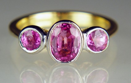 5.1mm round pink sapphire earstuds in rubover white gold setting. The pair of pink sapphire rounds weigh 0.60ct.