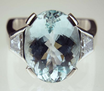 1.65ct mixed octagonal cut aquamarine set with 0.37ct tapered baguette diamonds D colour SI1 clarity in a handmade platinum ring