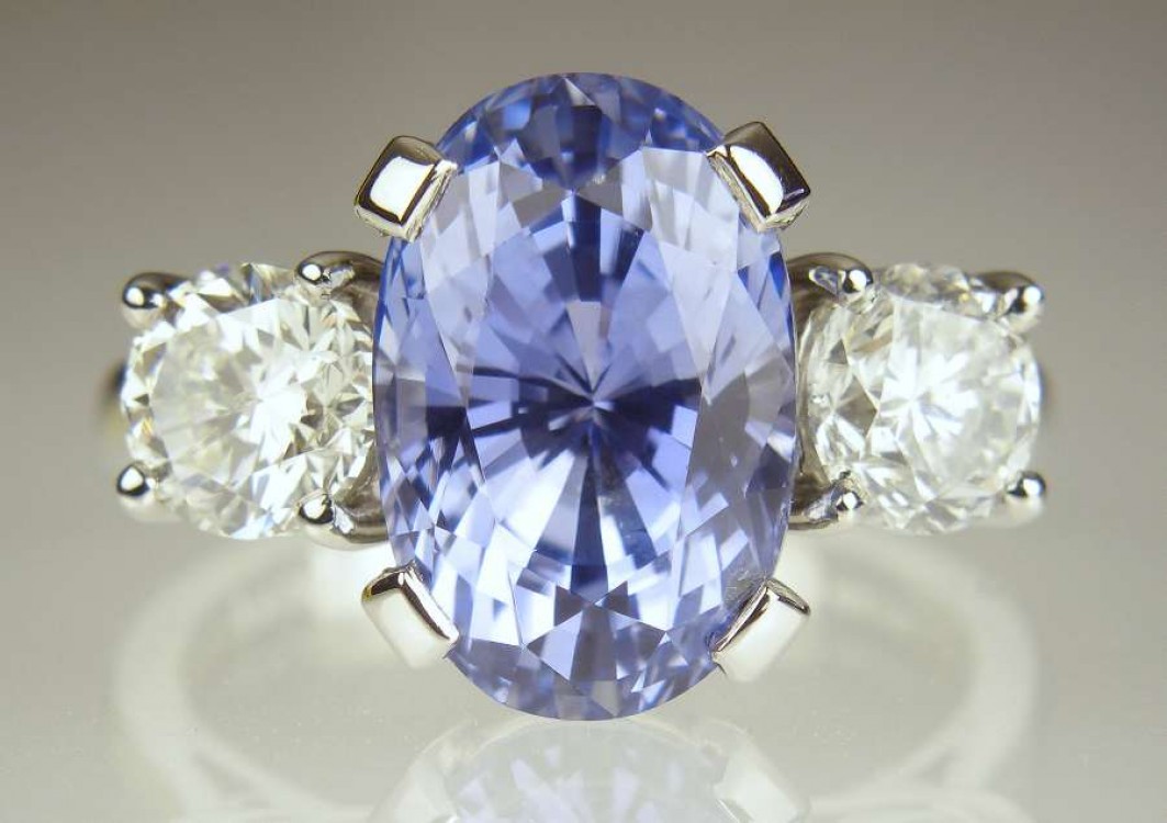 4.1ct round sapphire of exceptionally fine colour, set with a 0.63ct matched pair of G colour VS1 clarity taper cut diamonds in platinum