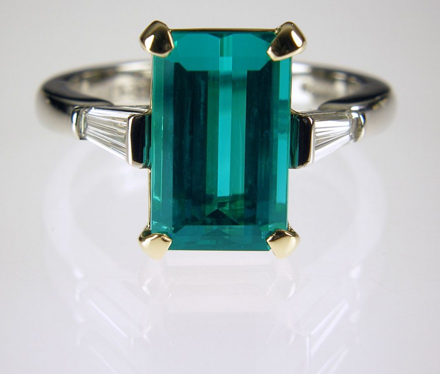 5.45ct octagonal mixed cut green sapphire set with 0.72ct trapezoid diamond pair I colour VS clarity set in 18ct yellow gold and platinum