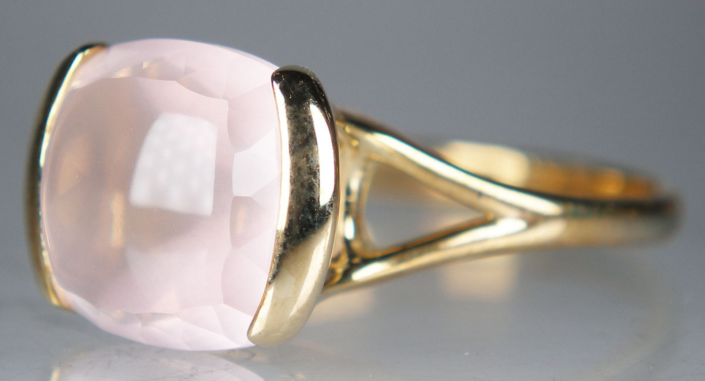 Cabochon cushion cut rose quartz ring in 9ct yellow gold // £ 265