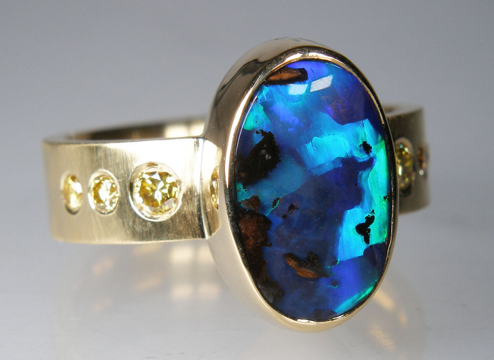 3.73ct oval boulder opal from Queensland, Australia, flanked by 3 pairs of round brilliant cut natural yellow diamonds. Total diamond weight is 0.21ct The opal is rubover set and the diamonds gypsy set in a 5mm wide, easy fit, heavy 18ct yellow gold ring.