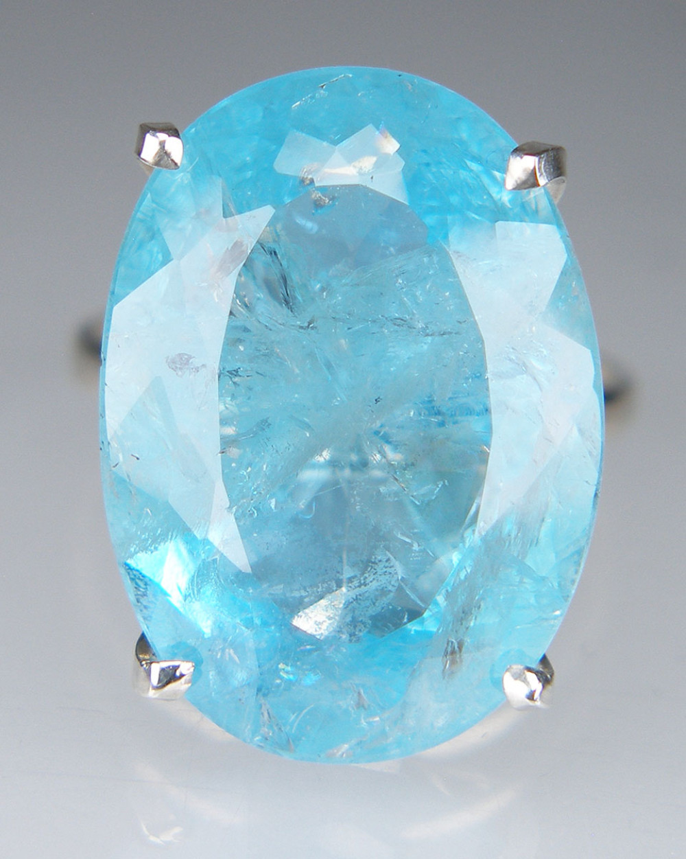 21 x 15mm faceted blue aquamarine, full of interesting inclusions and all the more beautiful for that, set in a simple four claw silver ring. This ring is for special occasion wear only and is sure to attract alot of attention. Aquamarine is from Minas Gerais, brazil.