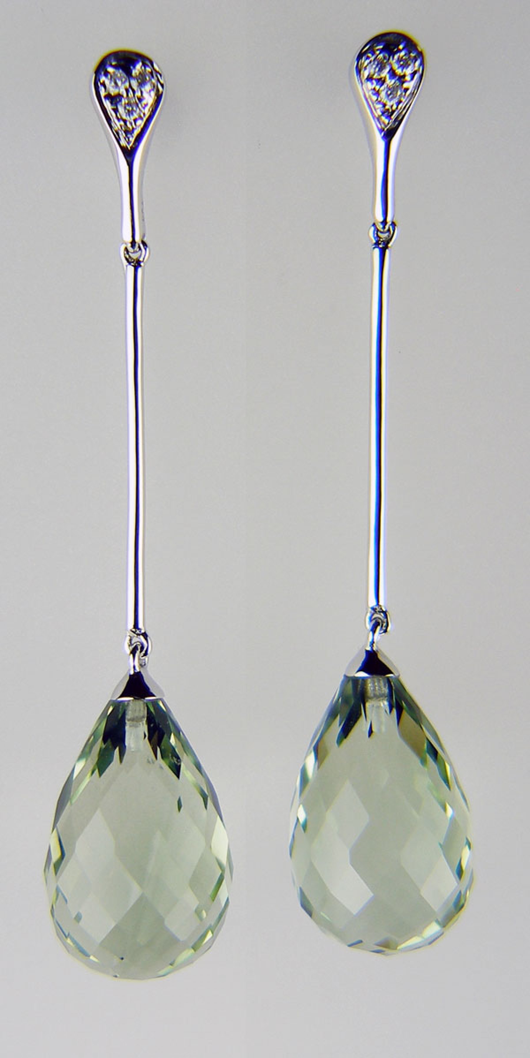 Delicate green quartz faceted drops suspended from delicate diamond studs in 18ct white gold
