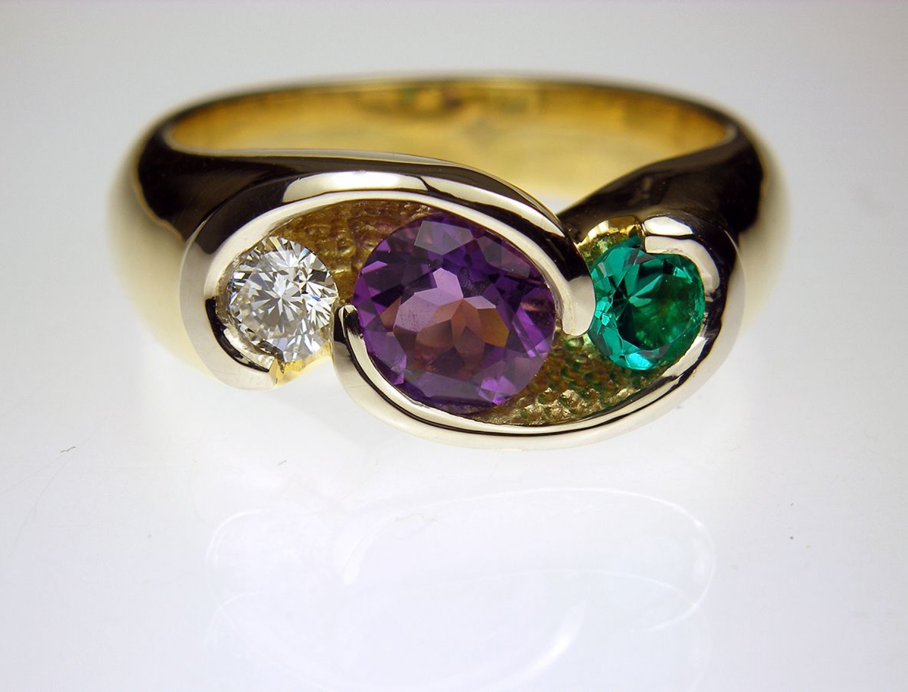 Amethyst, Diamond & Emerald Ring in 18ct yellow gold