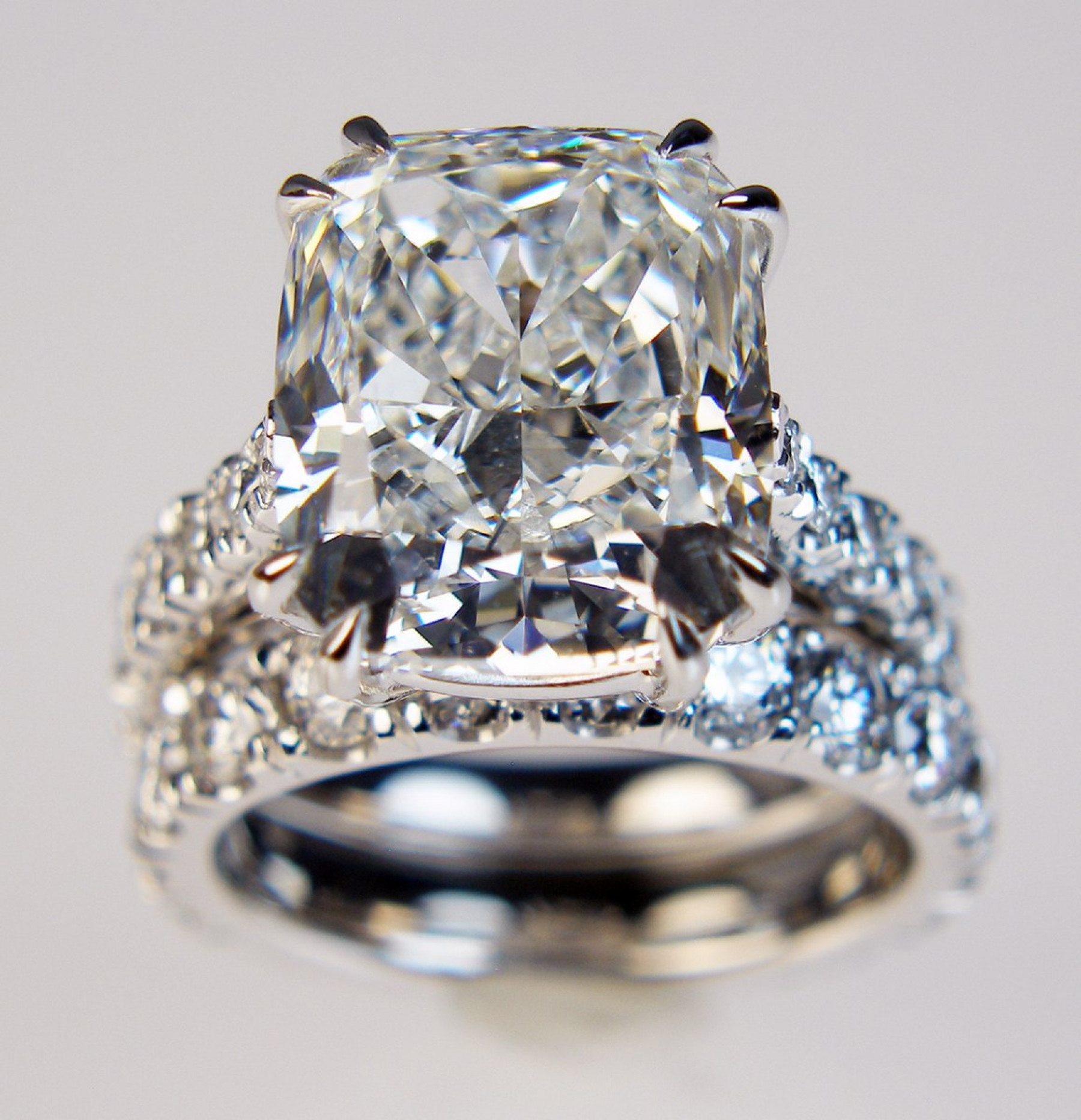 Exceptional F colour VS clarity GIA certified 10.06ct cushion cut diamond set with 1.36ct round brilliant cut diamonds and accompanied by a matching fullset wedding band with 2.19ct round brilliant cut diamonds, all in 18ct white gold.