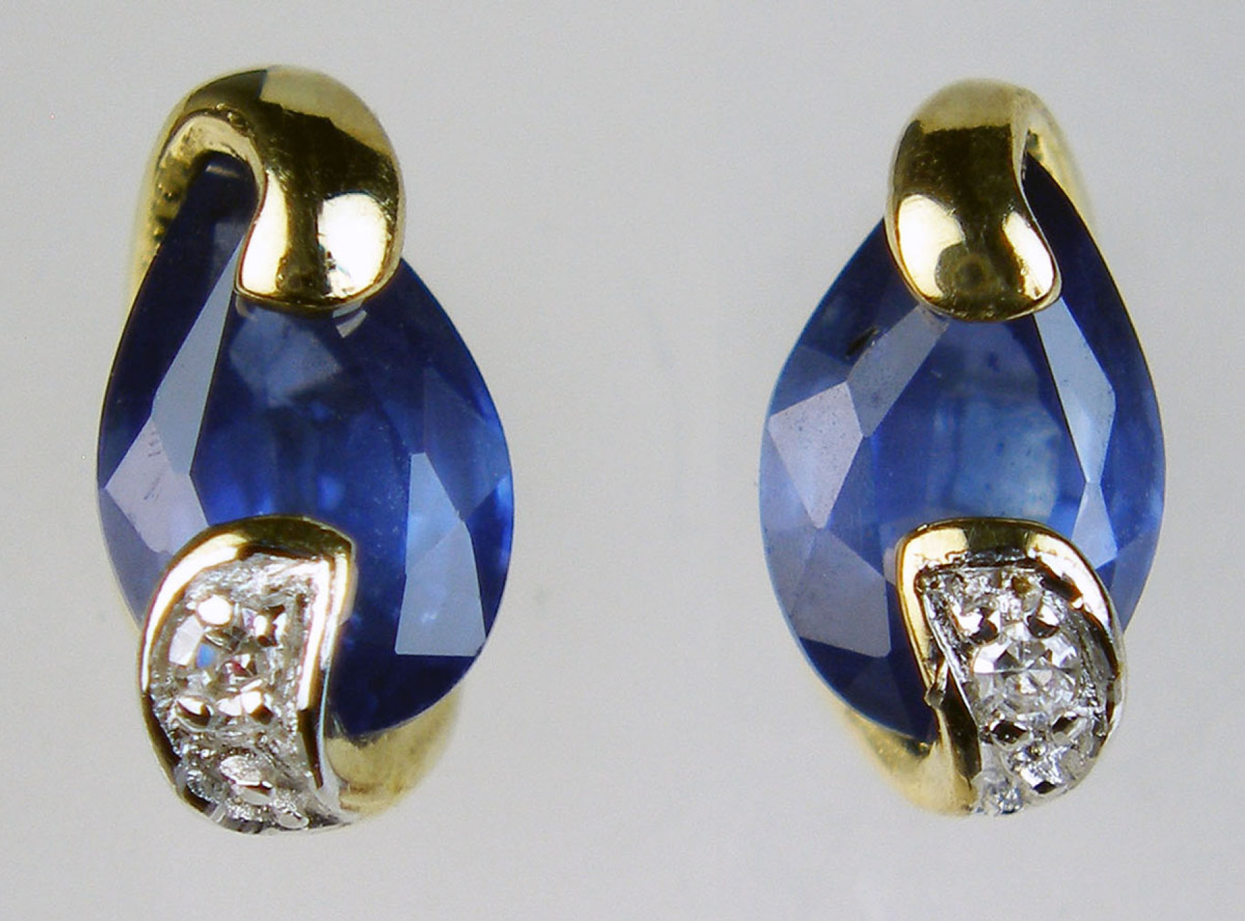 Dainty pear cut sapphires weighing 0.864ct and set with 1 point of round brilliant cut diamonds in 9ct yellow gold. Earstuds are 8mm long.