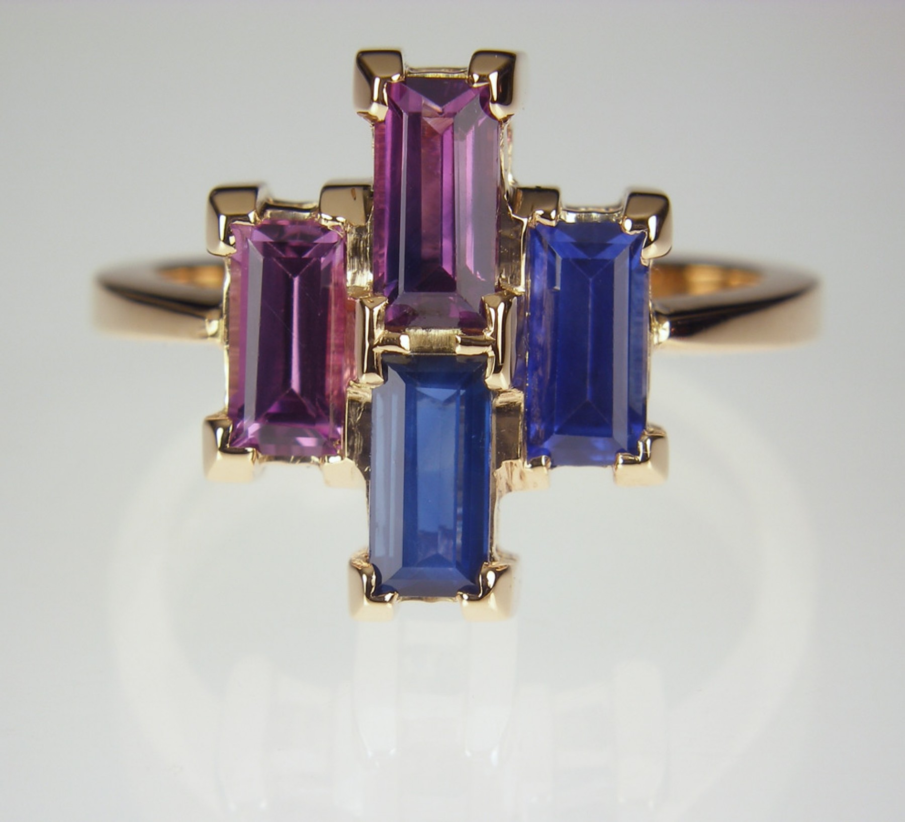 Baguette cut sapphires in shades of blue and pink set in 18ct rose gold.