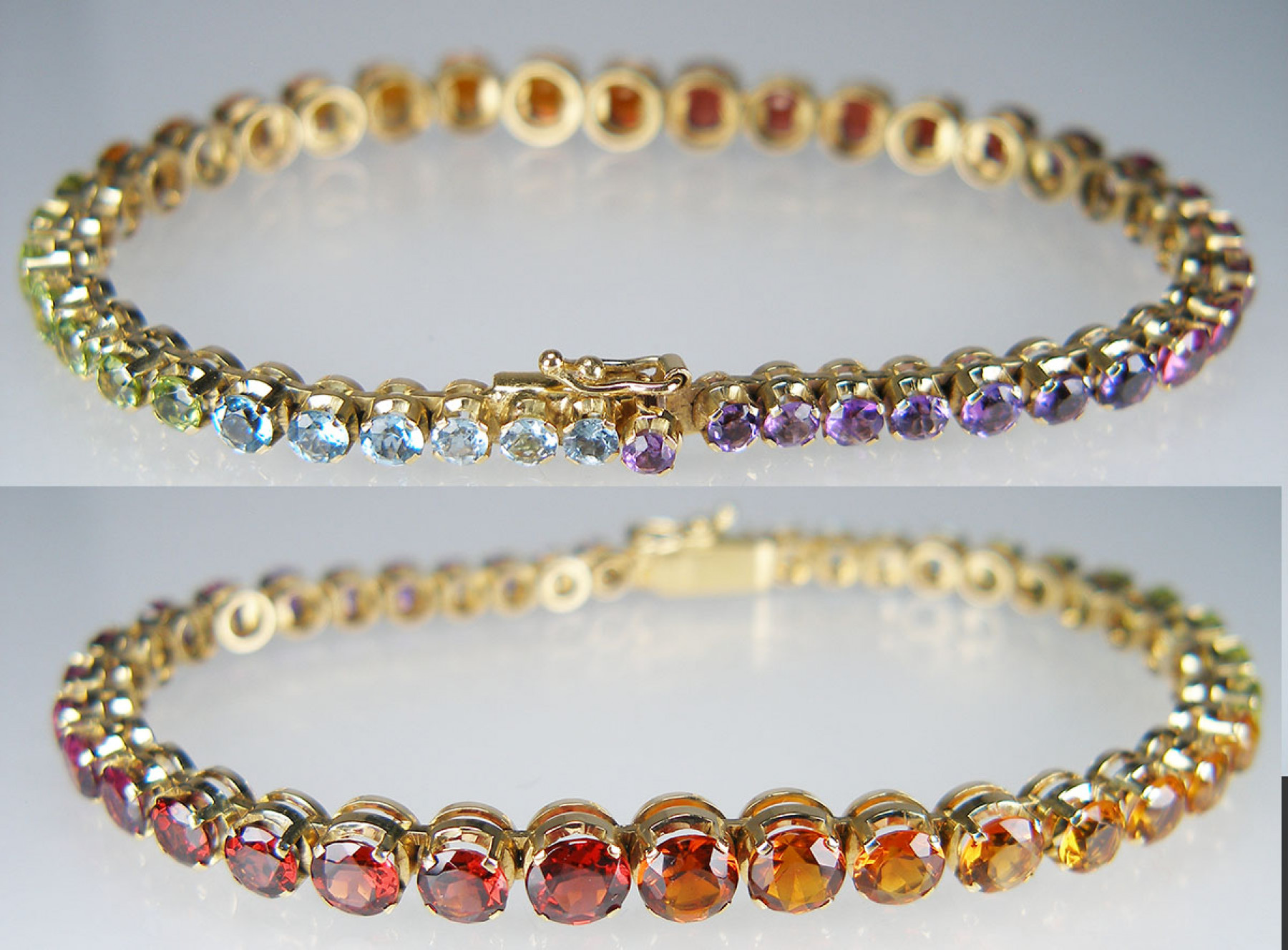 Attractive and solidly made gemset bracelet with round cut gems in various varieties (amethyst, almandine garnet, pyrope garnet, citrine,peridot, and aquamarine), claw mounted in 18ct yellow gold. Bracelet is hallmarked in London 1983. This pre-loved bracelet is in excellent condition.The bracelet length is 7 1/2” and comes complete with a safety lock. The gems range from 5.5 -3mm in diameter.