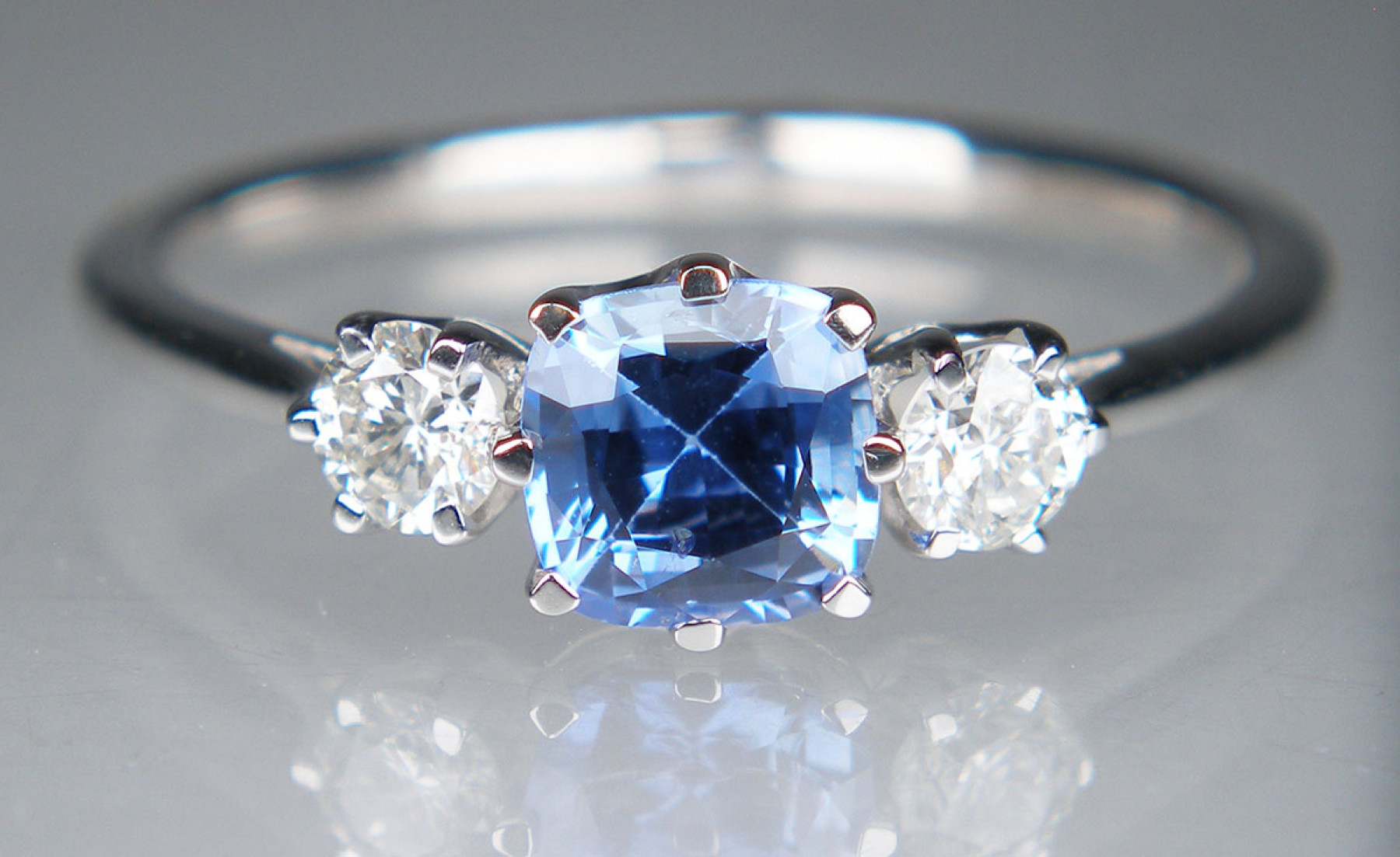 Dainty sapphire & diamond ring in platinum set with a 0.73ct cushion cut mid blue natural sapphire, flanked by a 0.24ct pair of G colour VS clarity round brilliant cut diamonds. The gems are all claw set in platinum. Ring size is N