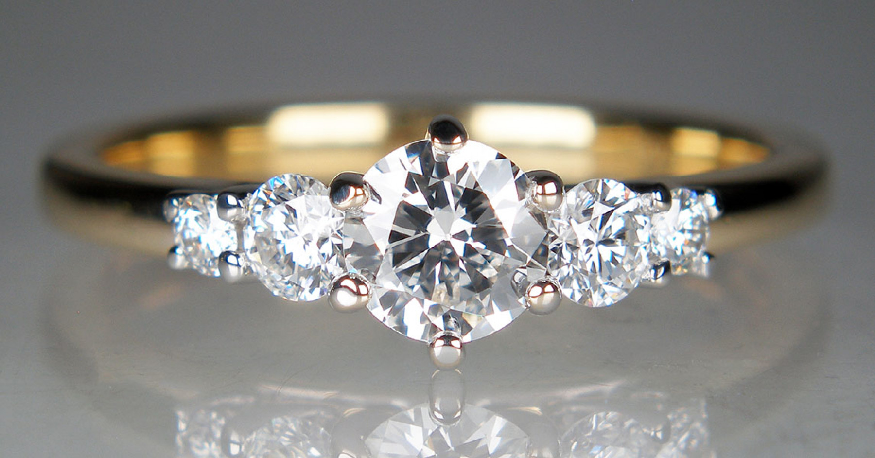0.68ct of round brilliant cut diamonds in F colour VS clarity, claw set in 18ct white gold and mounted on an 18ct yellow gold shank. Ring is wedfit (it will sit snuglu against a diamond set or plain wedding band) and size N.