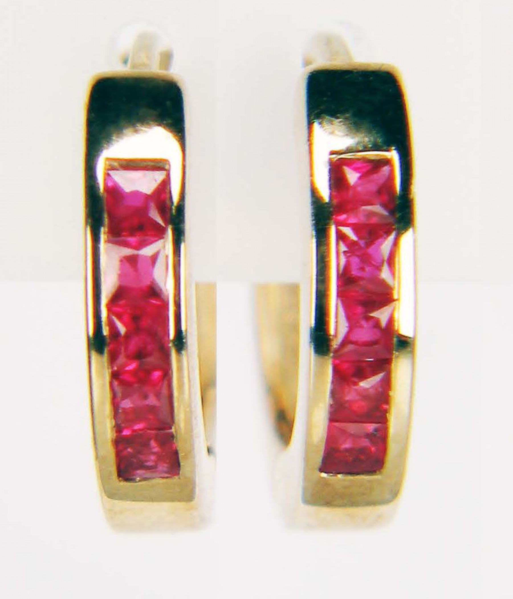Cute and practical ruby huggie earhoops in 9ct yellow gold. Earhoops are fully circular and measure 15mm outside diameter. They contain 0.40ct of princess cut fine quality rubies. These earhoops are included in our 20 year anniversary 50% sale and now cost £297.50
